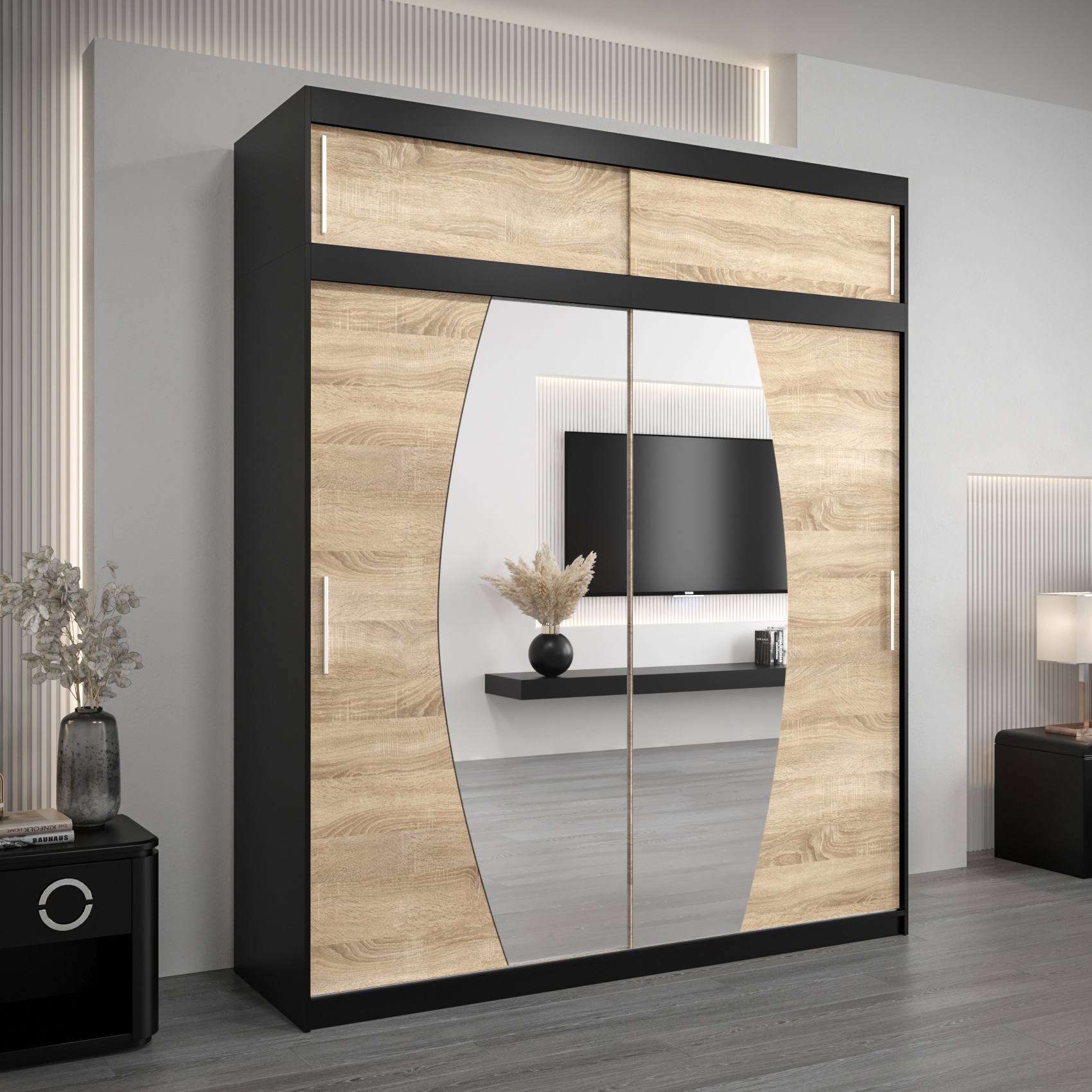 Moderne schuifdeur kledingkast ELIPSO 200 met uniek uitgesneden spiegel. Stevig laminaat, BIMARK schuifsysteem en veel opbergruimte.