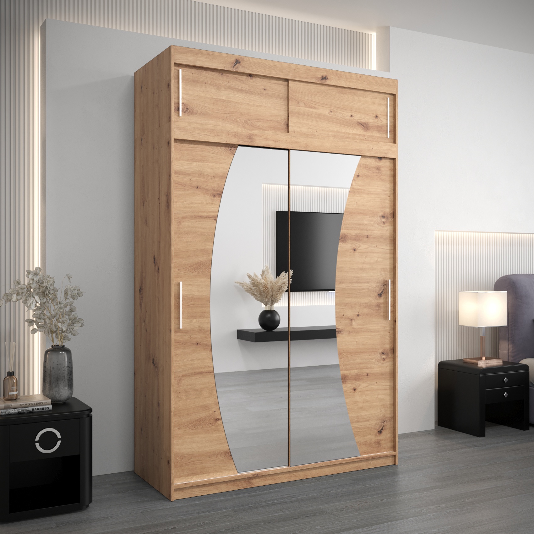 De grote, volledig geslepen spiegelpanelen op de fronten laten de kamer optisch groter lijken en zorgen voor meer lichtinval. Tegelijkertijd zijn ze bijzonder praktisch tijdens het aankleden of dagelijkse stylingmomenten.