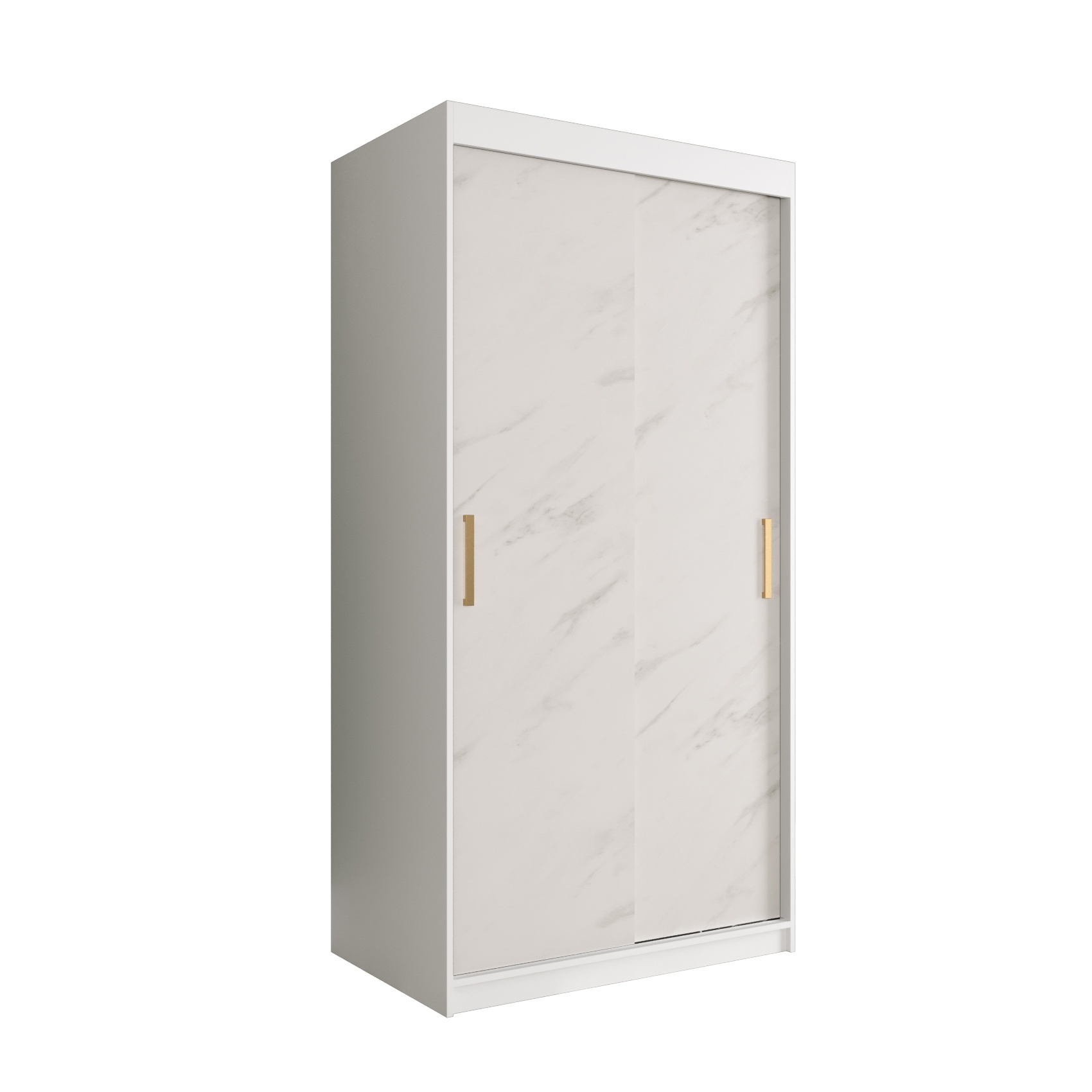 De schuifdeurkast MARMUR combineert een elegante marmerlook met luxe gouden grepen en een praktisch interieur. Dankzij de slimme indeling biedt deze kast volop ruimte voor kleding, schoenen en accessoires.