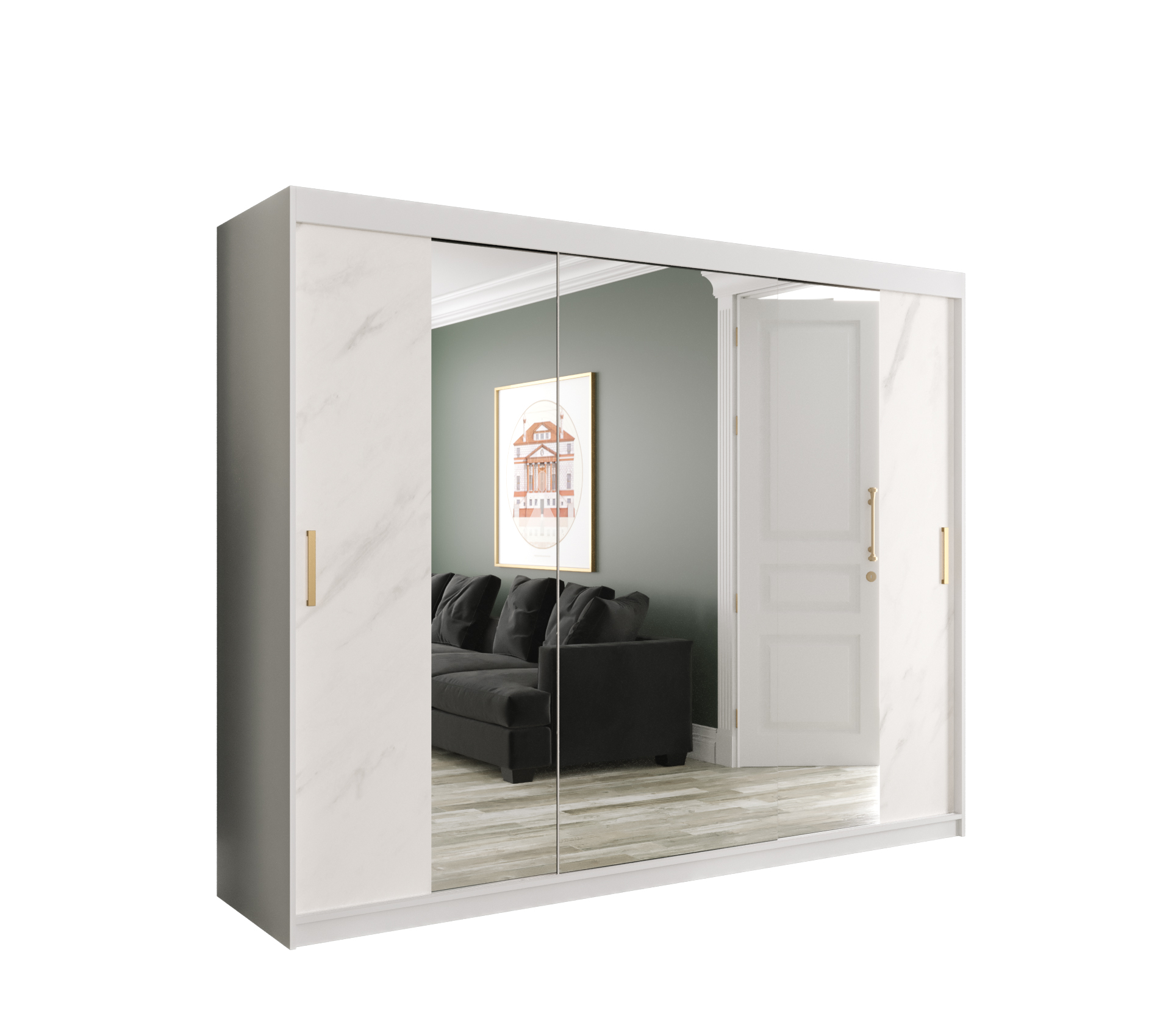 MARMUR T2 schuifdeurkast 250 cm met spiegel, marmerlook en gouden grepen.