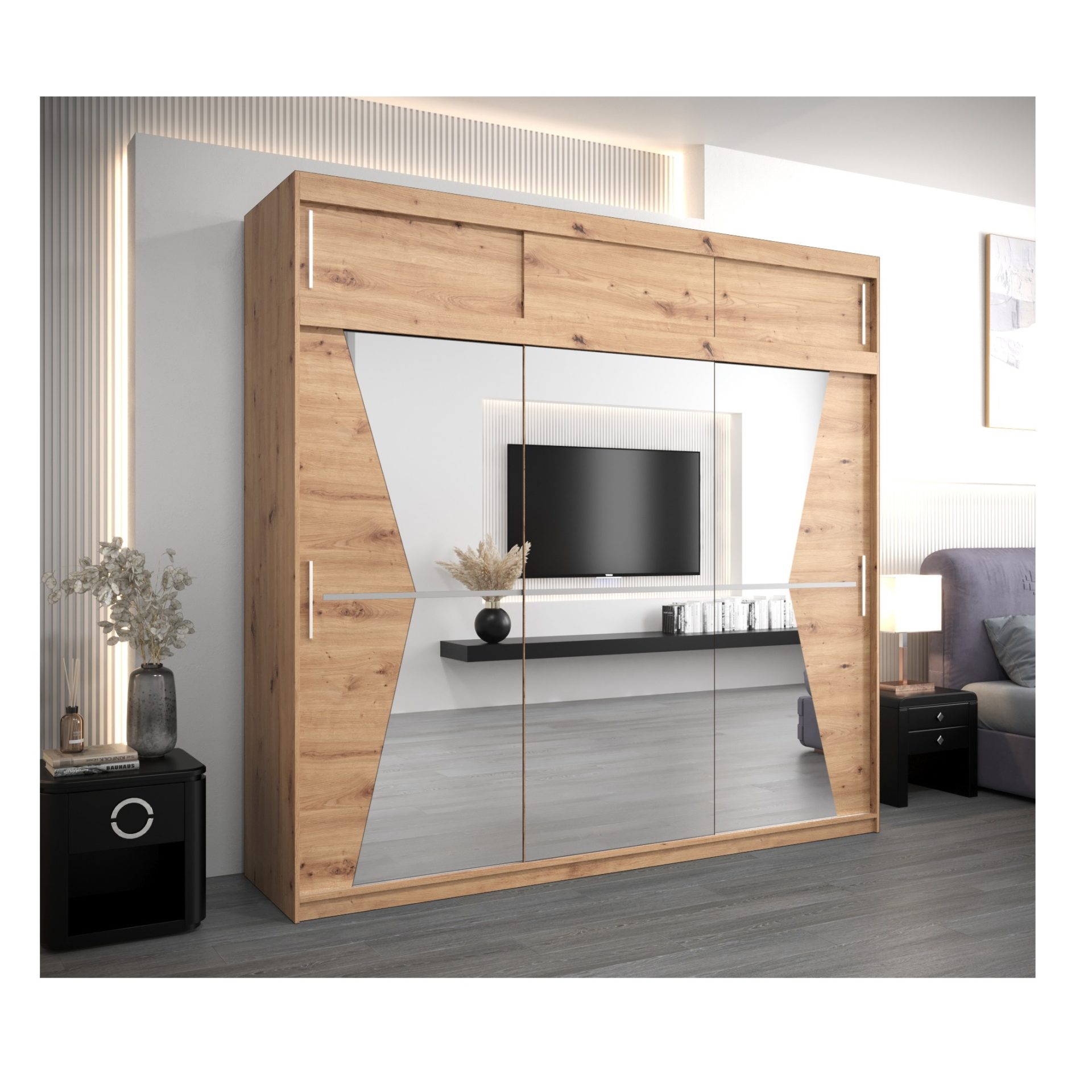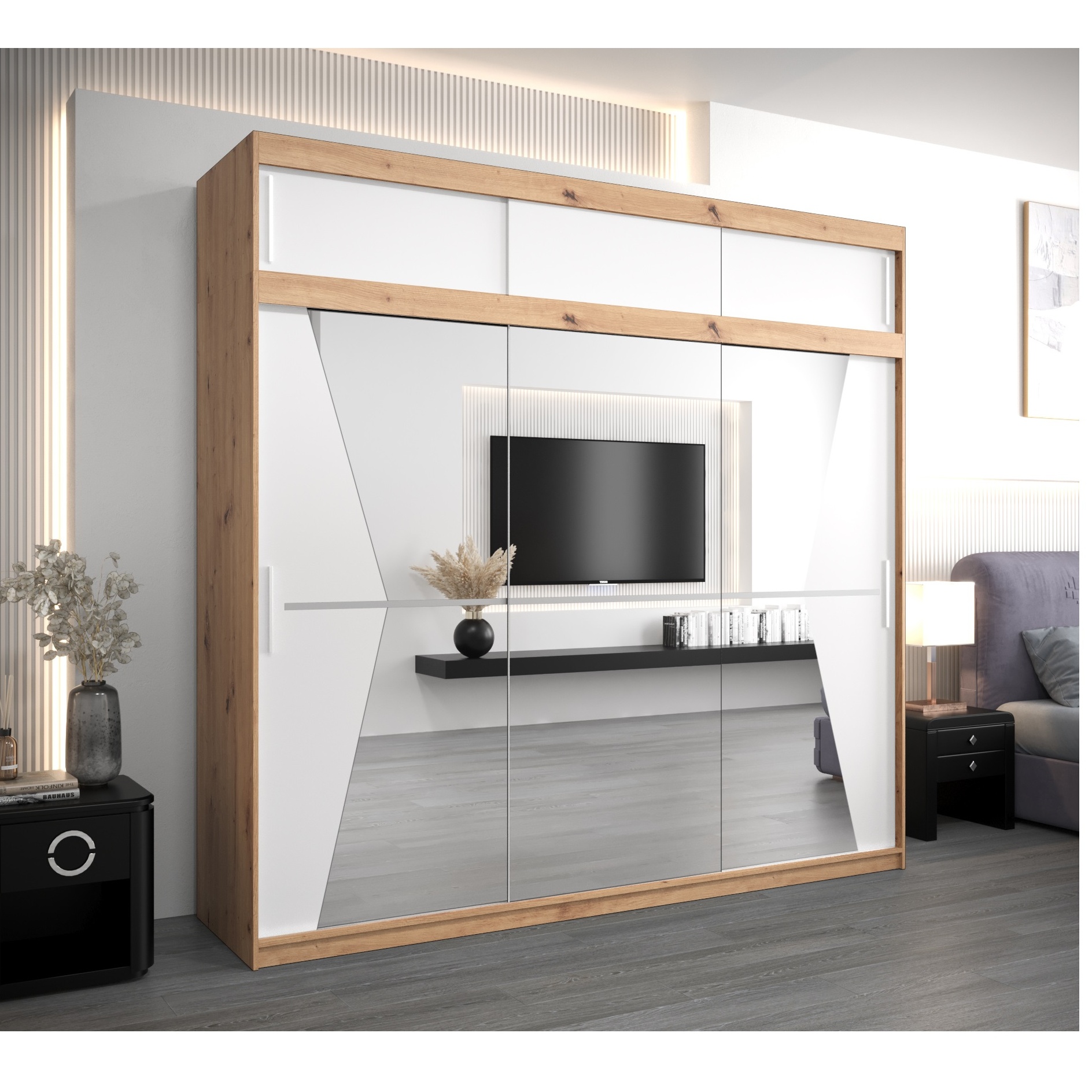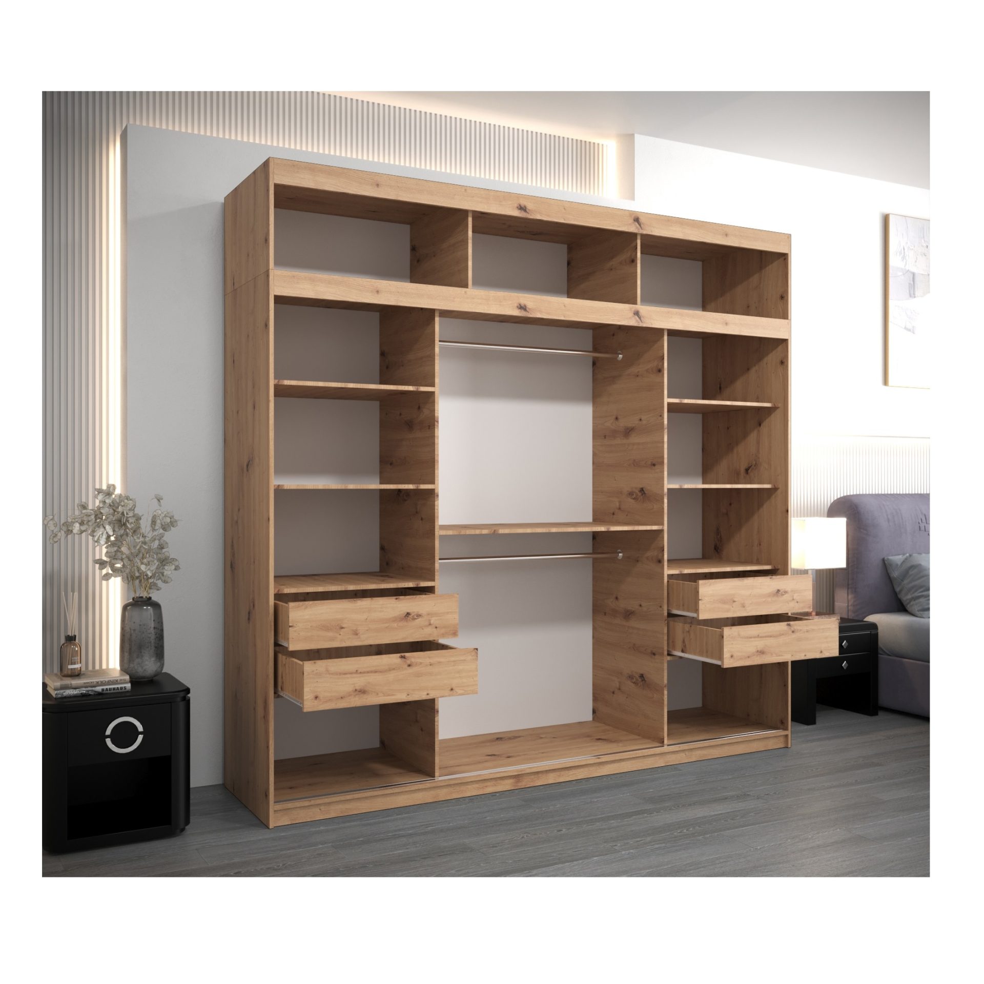 De kast is verkrijgbaar in diverse kleurencombinaties – van tijdloos wit en zwart tot warme houttinten zoals eiken artisan en eiken sonoma. Zo sluit de MAROKO kast altijd naadloos aan bij uw woonstijl.