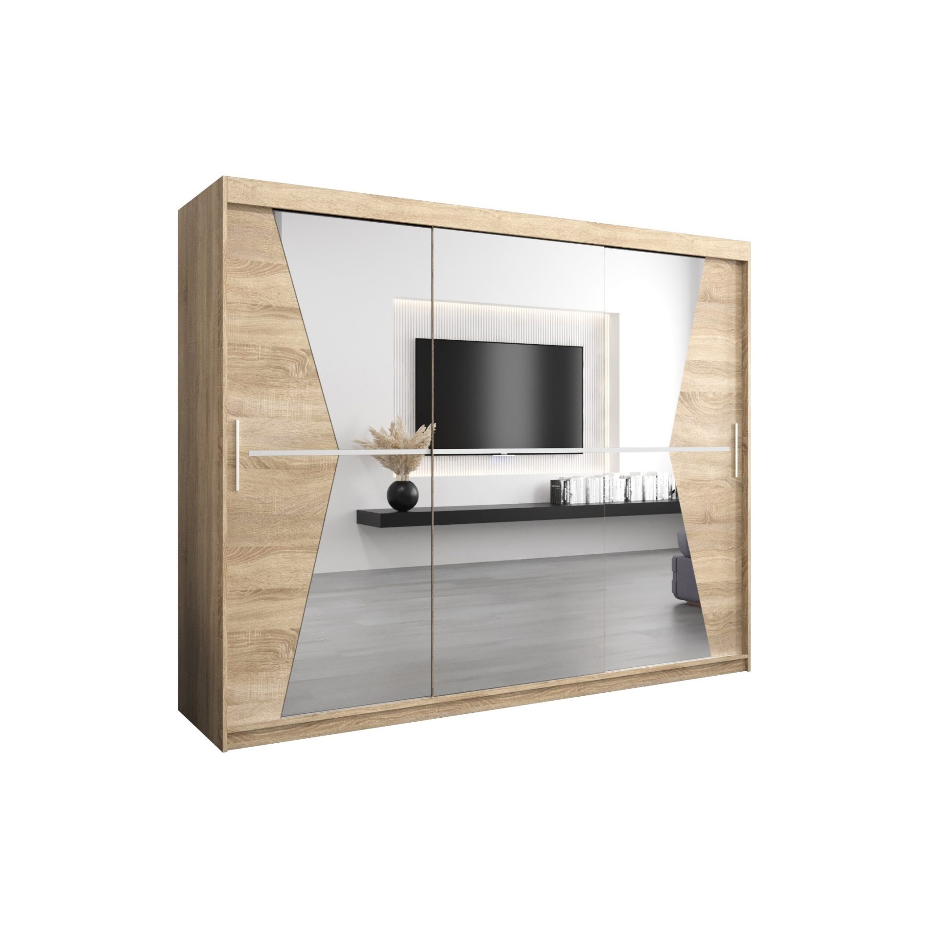 De MAROKO schuifdeurkast van 250 cm breed is een perfecte keuze voor wie op zoek is naar een ruime, stijlvolle en praktische opbergoplossing. De kast is uitgerust met een geslepen spiegel op de fronten, waardoor uw interieur niet alleen lichter en ruimer oogt, maar ook een elegante uitstraling krijgt.