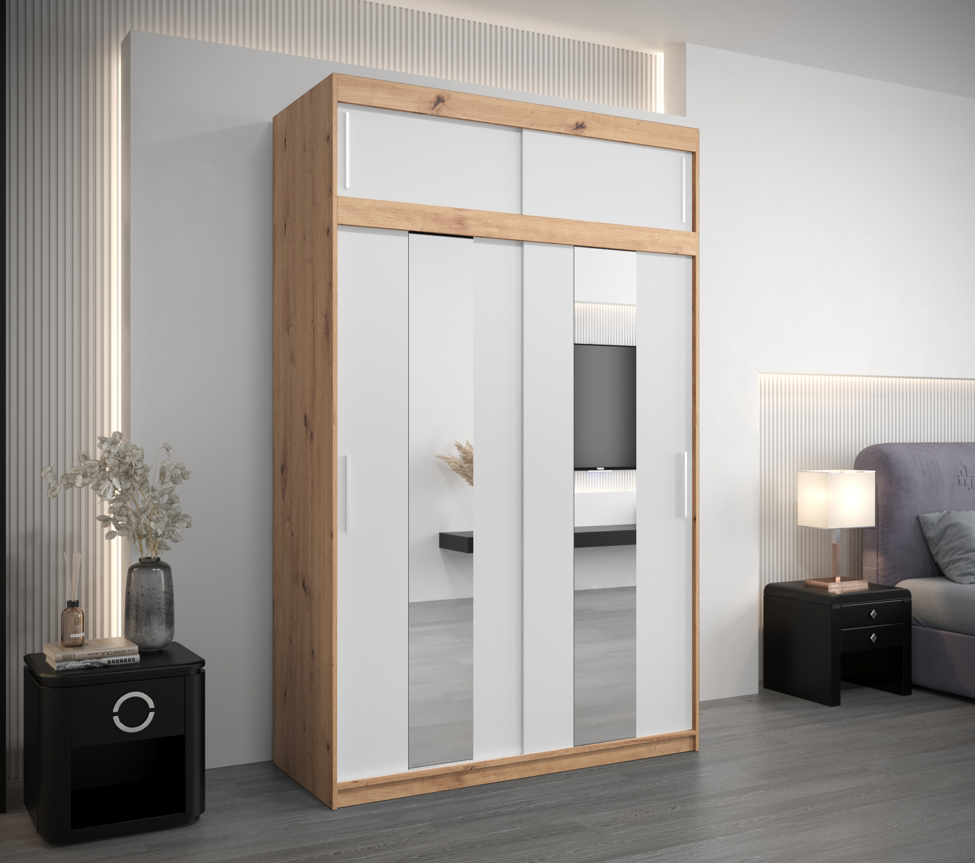 Dankzij de slimme indeling met planken, kledingroede en optionele laden of bovenkast biedt de kast voldoende ruimte om al uw kleding netjes te organiseren. De spiegel op de deur zorgt ervoor dat uw kamer groter en lichter lijkt.