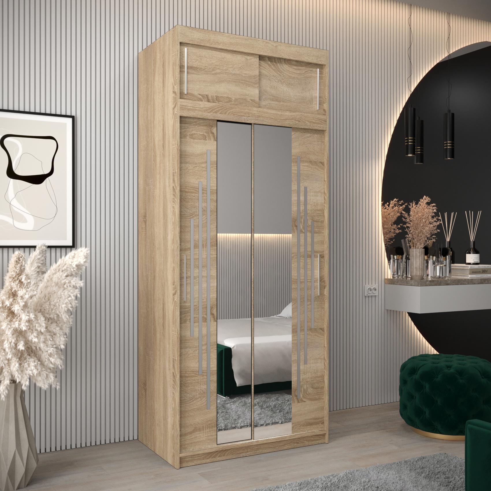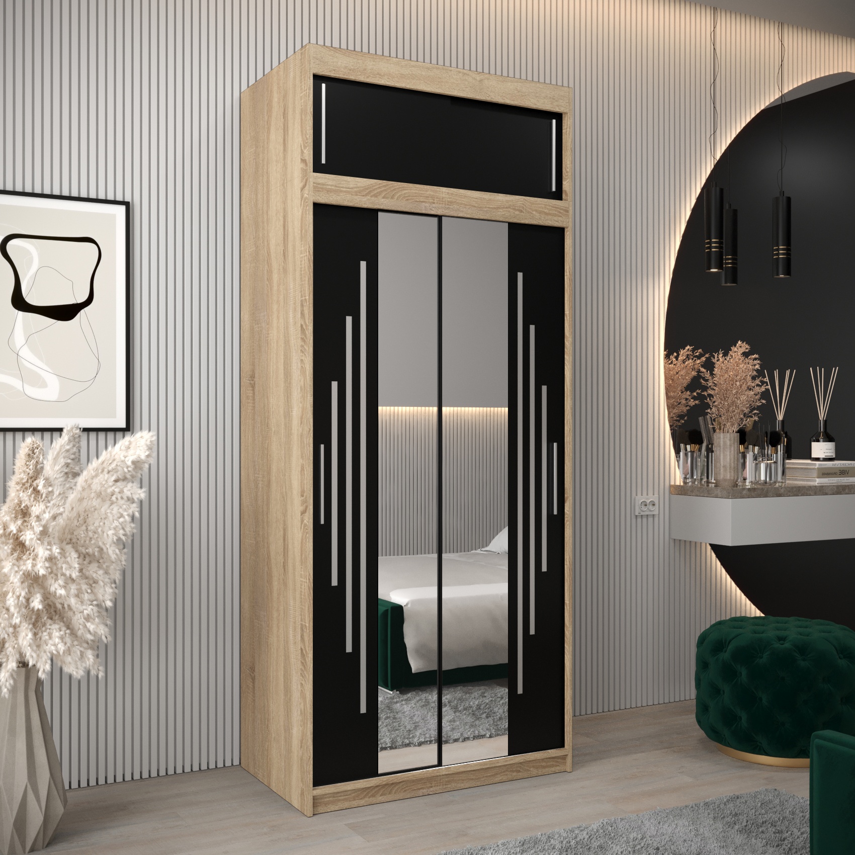 - Bovenkast – met een hoogte van 40 cm, perfect als verlenging van de kast. De breedte en diepte zijn identiek aan die van de kledingkast, waardoor een harmonieus en stijlvol geheel ontstaat.