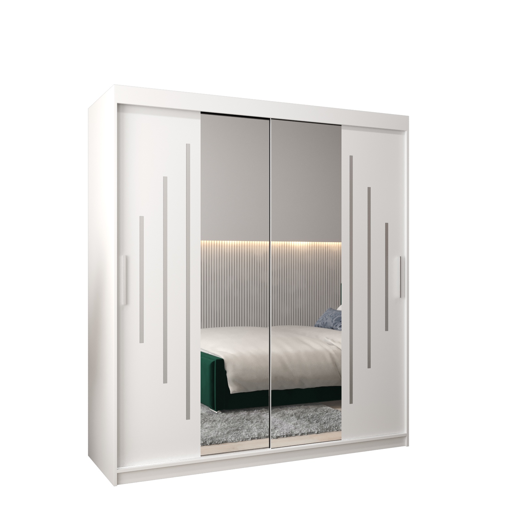 De gladde fronten geven de kast een moderne uitstraling, terwijl de zilverkleurige decorlijsten subtiele luxe toevoegen. De schuifdeuren werken op een LAGUNA railsysteem, wat zorgt voor een stille en soepele opening, zelfs bij dagelijks gebruik.
