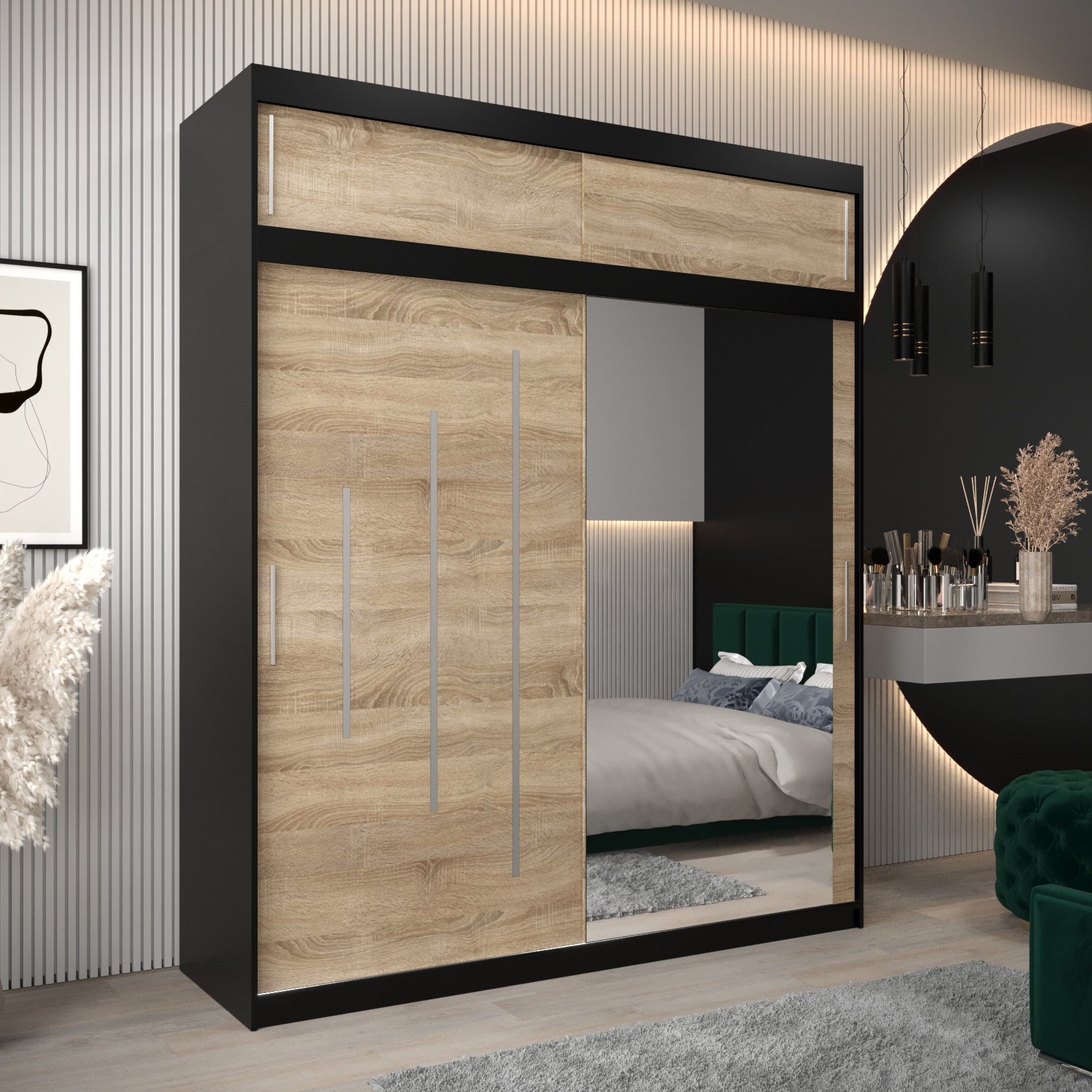 - Bovenkast – met een hoogte van 40 cm, perfect als verlenging van de kast. De breedte en diepte zijn identiek aan die van de kledingkast, waardoor een harmonieus en stijlvol geheel ontstaat.