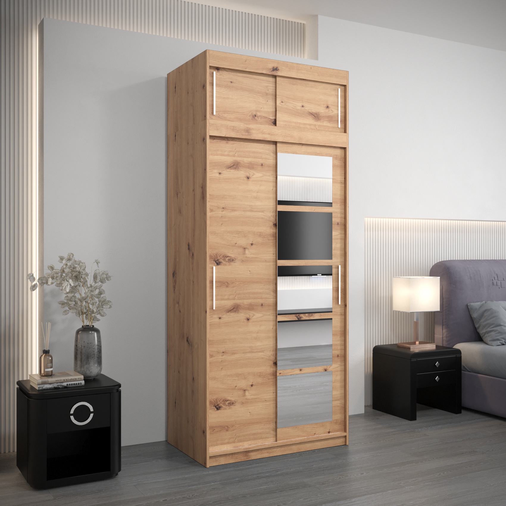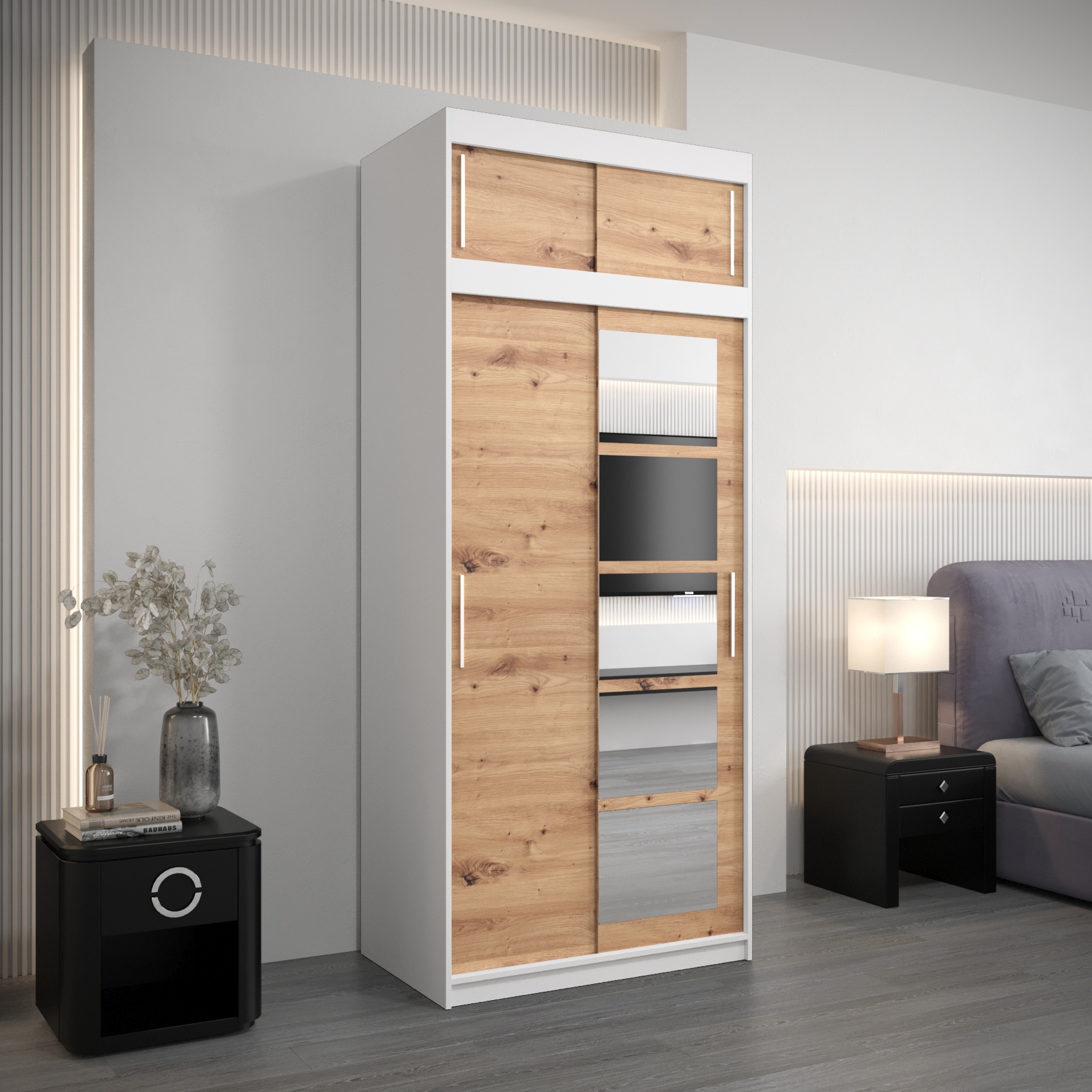 - Bovenkast – met een hoogte van 40 cm, perfect als verlenging van de kast. De breedte en diepte zijn identiek aan die van de kledingkast, waardoor een harmonieus en stijlvol geheel ontstaat.