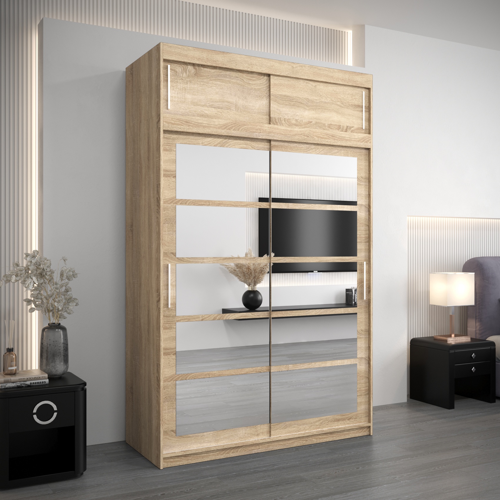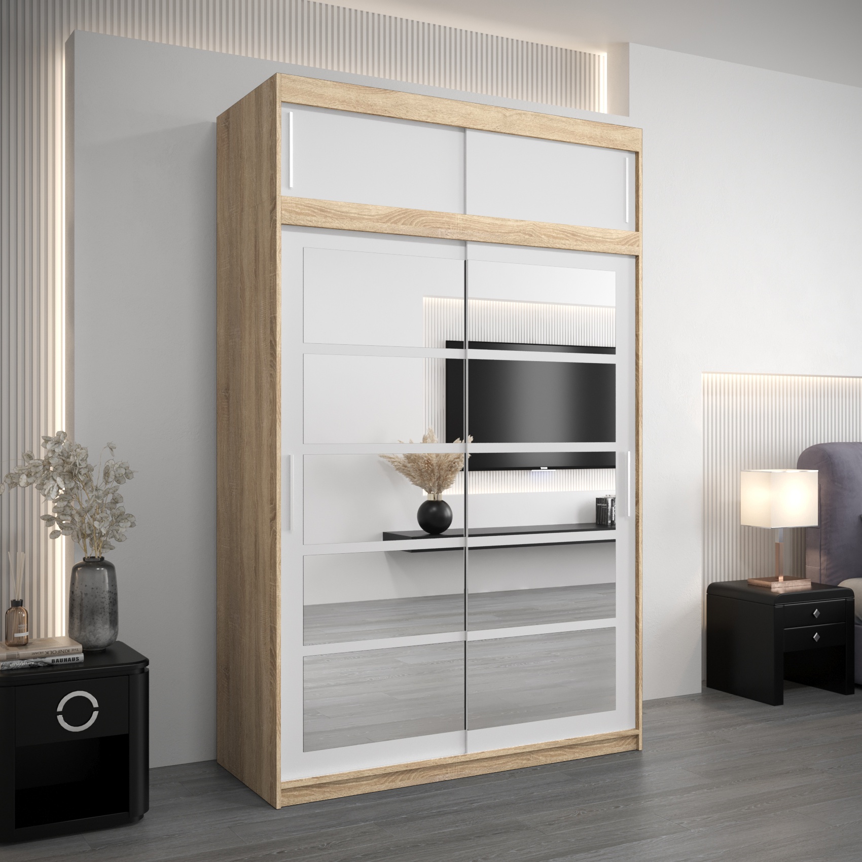 De RENO 2 kledingkast 150 cm is een stijlvolle schuifdeurkast met een uniek spiegelontwerp dat direct de aandacht trekt.