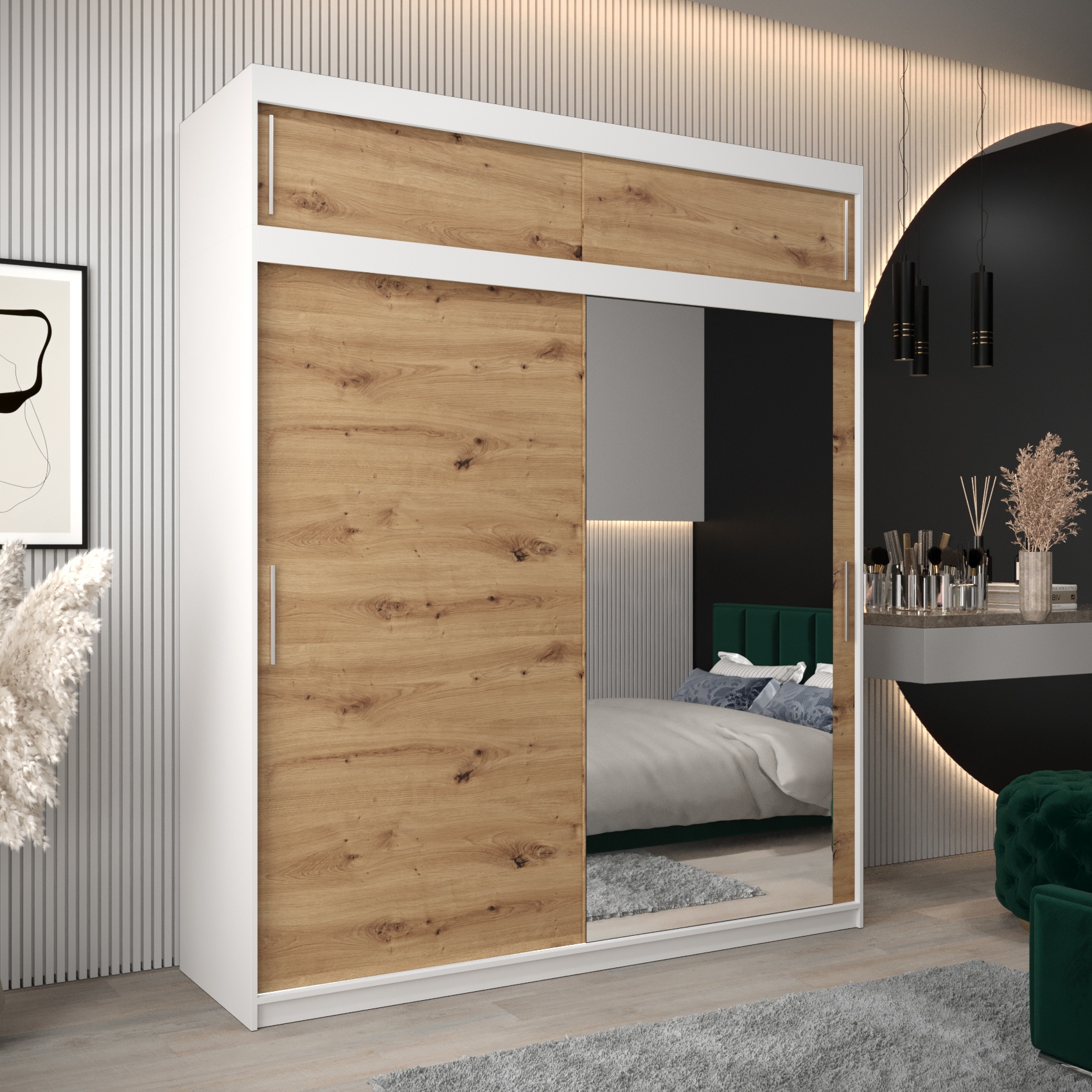 De minimalistische vormgeving en de modieuze kleurencombinaties – wit mat, zwart mat, eik sonoma of artisan – zorgen ervoor dat de kast perfect past in elke slaapkamer of garderobe.