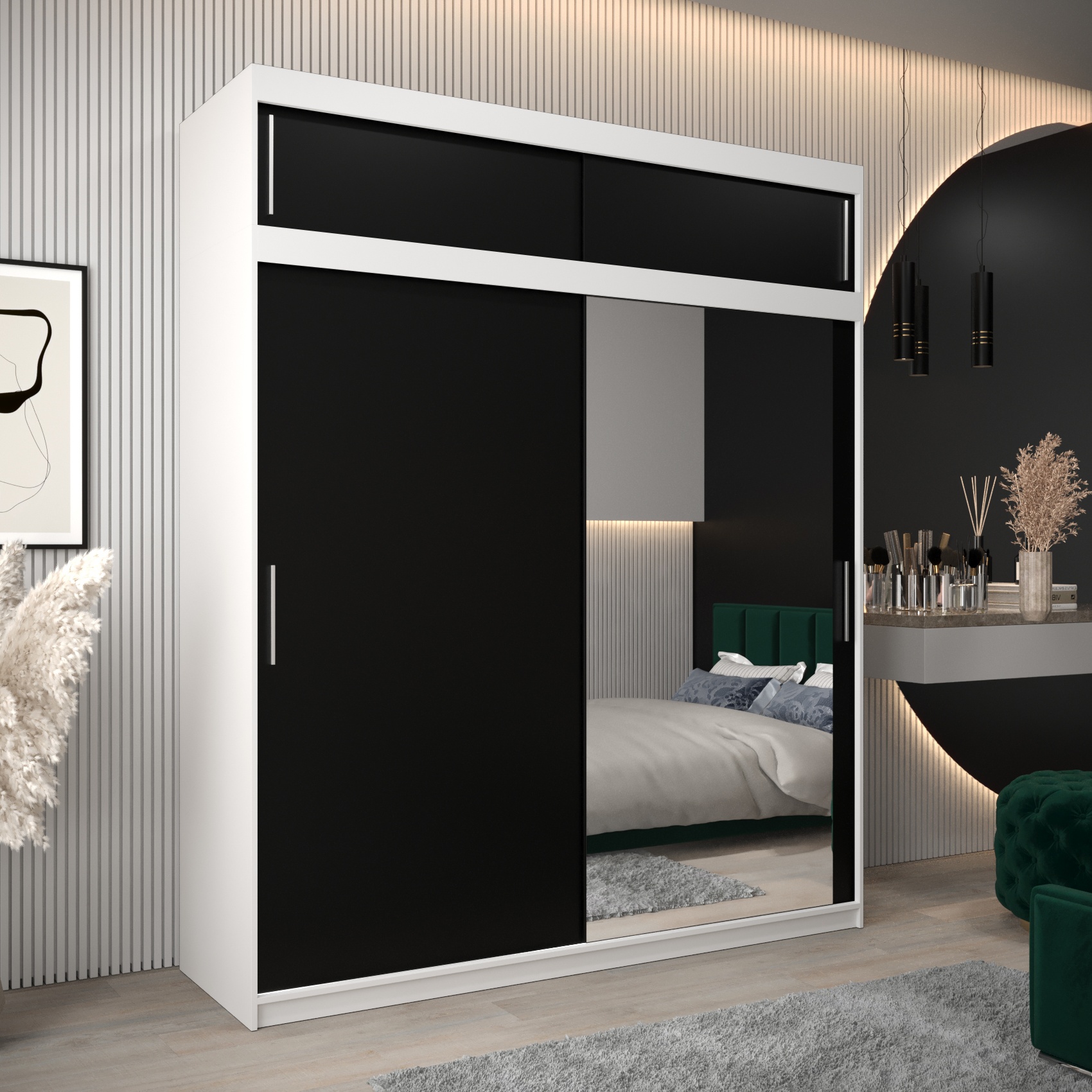 • Bovenkast – met een hoogte van 40 cm, perfect als verlenging van de kast. De breedte en diepte zijn identiek aan die van de kledingkast, waardoor een harmonieus en stijlvol geheel ontstaat.