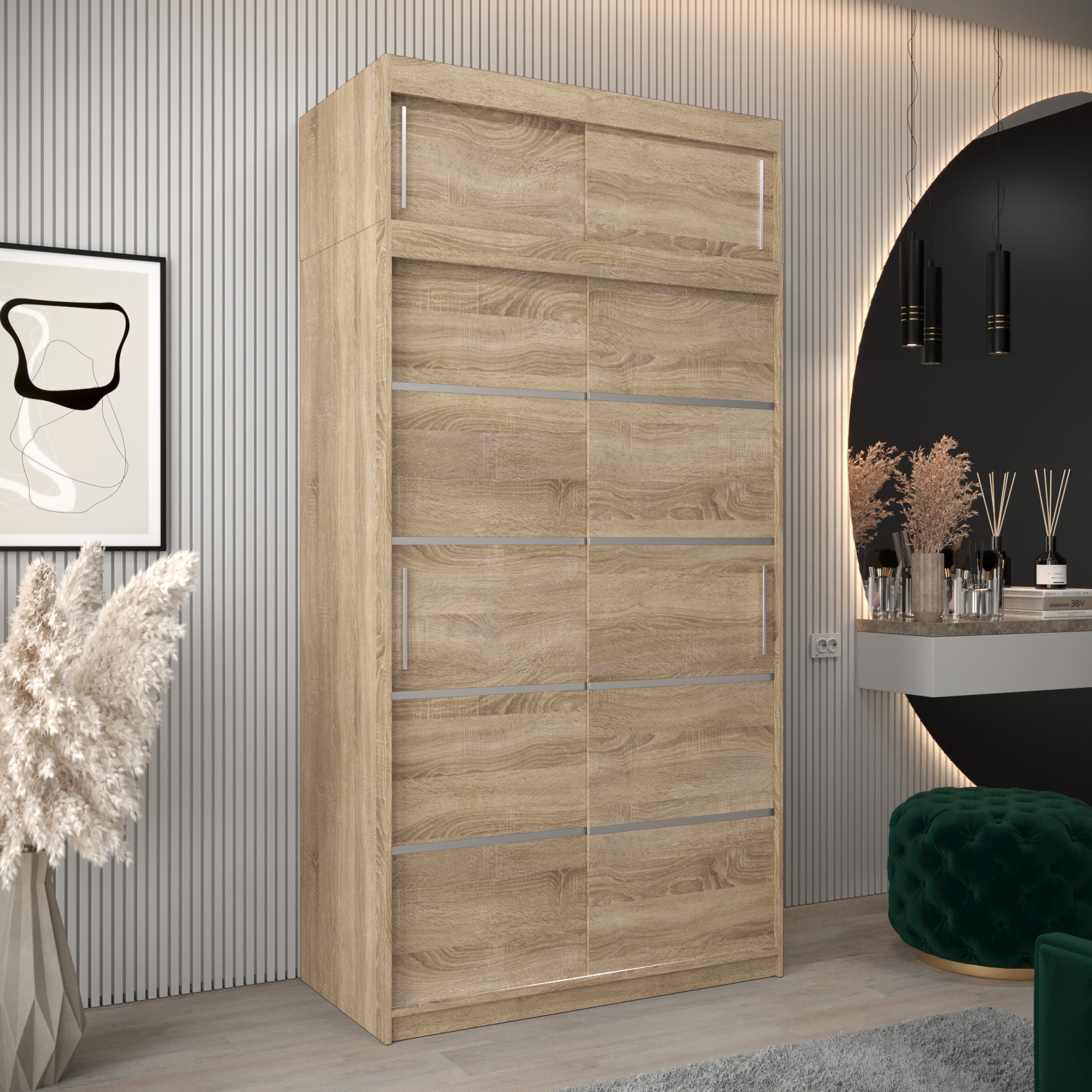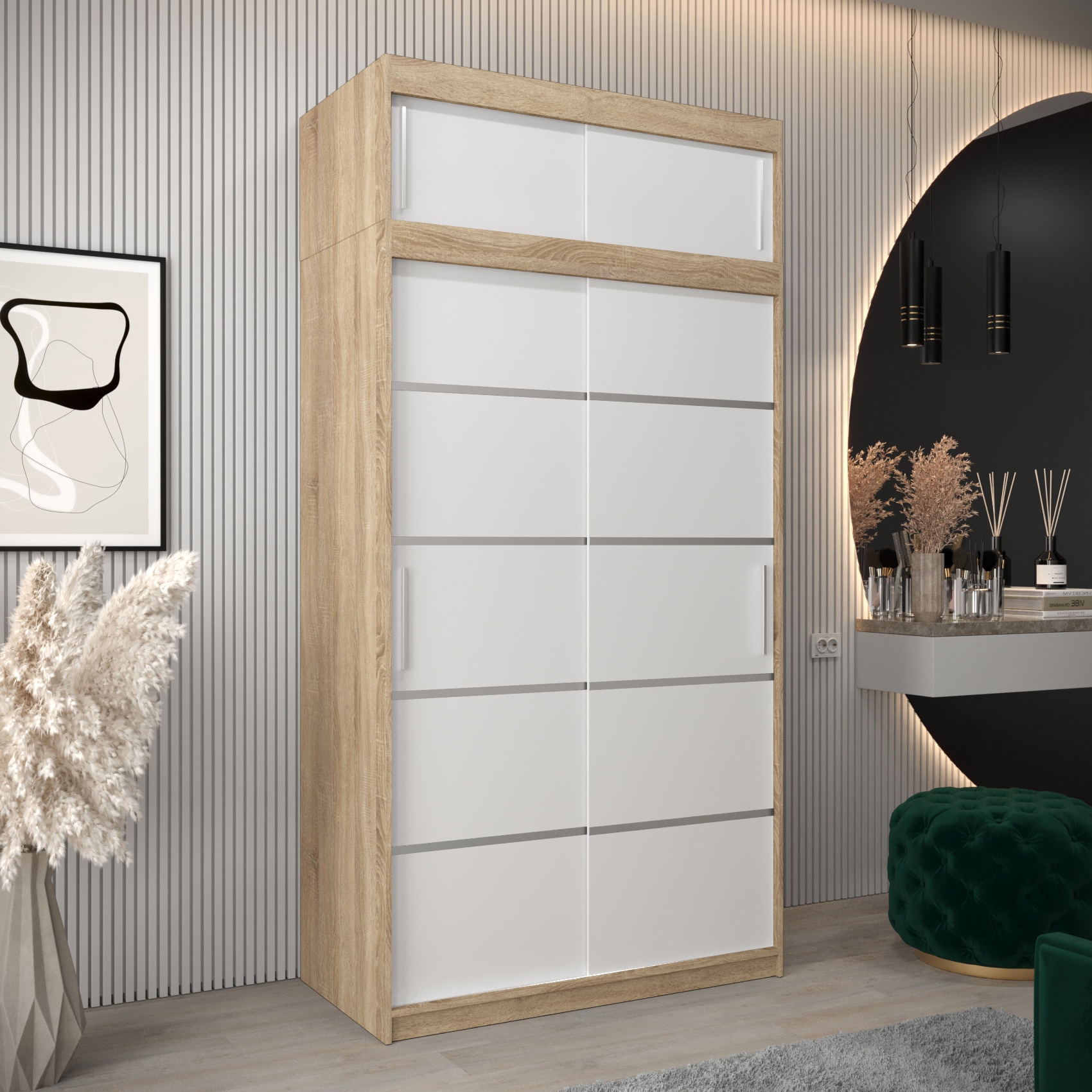 De kast is verkrijgbaar in verschillende kleurafwerkingen, waardoor u een interieur kunt creëren dat uw persoonlijke stijl weerspiegelt. De zilverkleurige decoratieve strips en gladde schuifdeuren geven de kast een verfijnde, moderne uitstraling.
