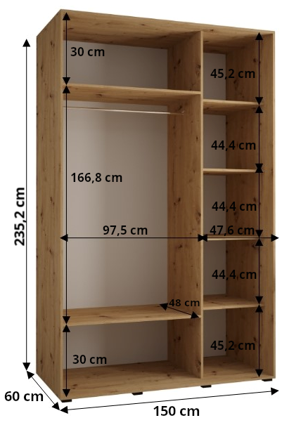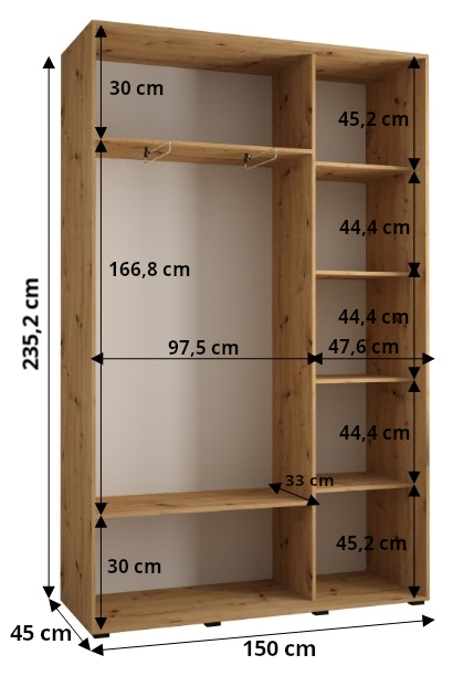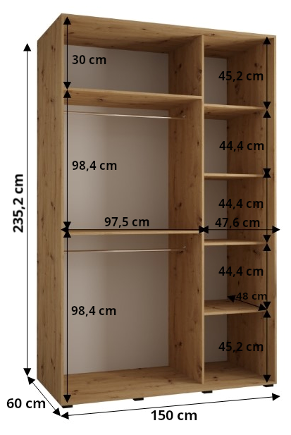 De schuifkast Lanko 1 (150 cm breed) is een moderne en ruime kledingkast voor wie behoefte heeft aan meer diepte en comfort in dagelijks gebruik. Met een diepte van 60 cm biedt deze kast extra ruimte voor kleding op hangers, terwijl de hoogte van 235,2 cm zorgt voor optimale benutting van de beschikbare ruimte.