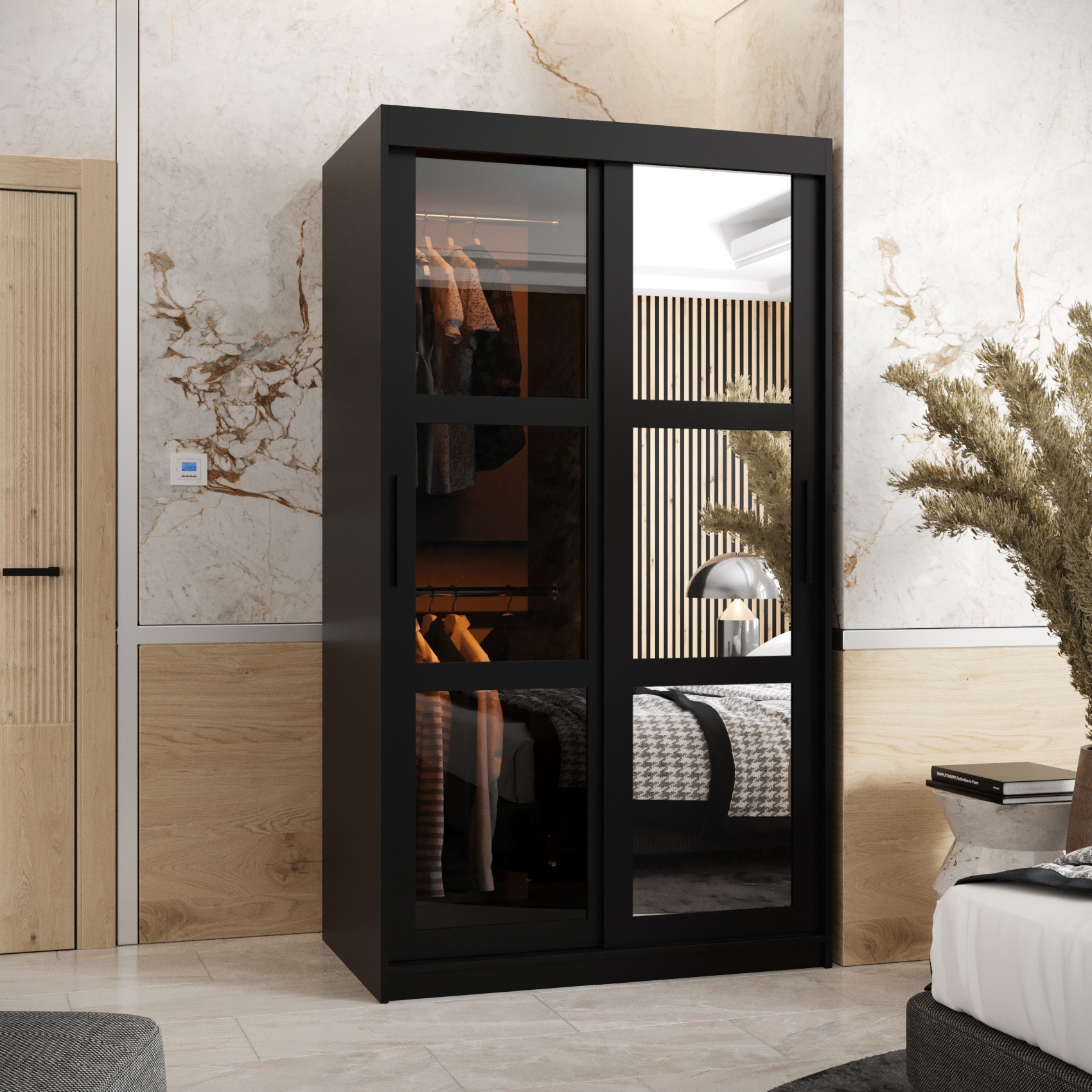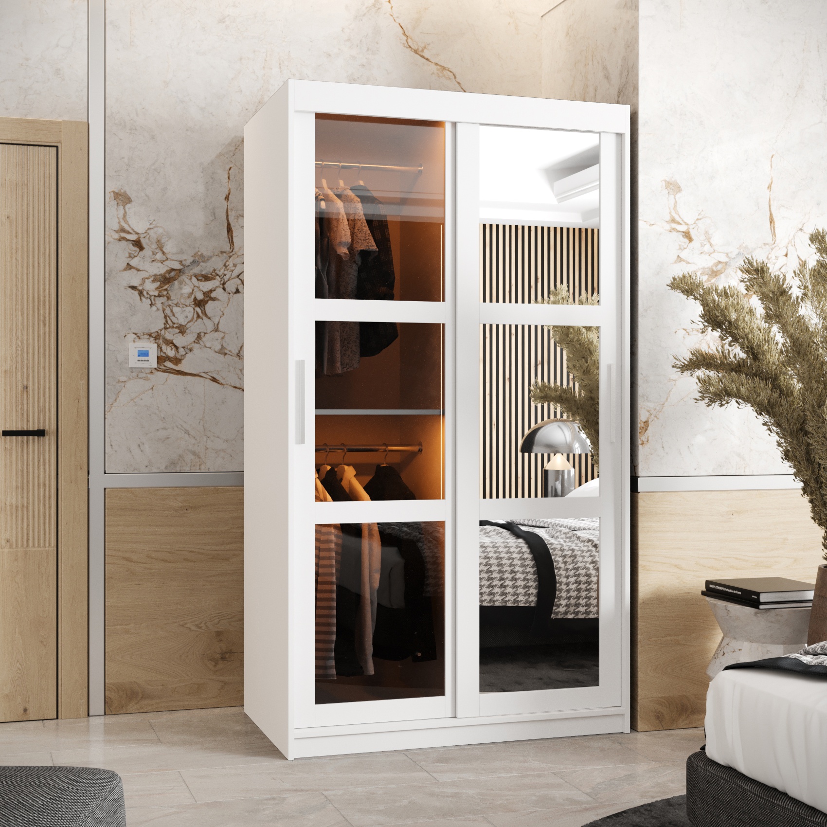 Een elegante schuifdeurkast, perfect voor uw slaapkamer, hal of kantoor. Binnenin vindt u legplanken en een roede voor overzichtelijke kledingopslag. Het moderne en minimalistische ontwerp past moeiteloos in elk interieur.